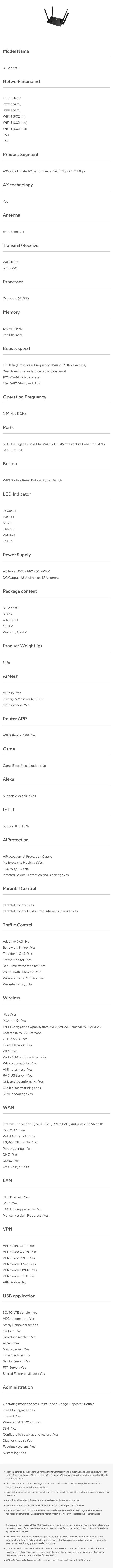 ASUS RT-AX53U AX1800 Dual Band WiFi 6 Router – Network Standard: WiFi 6 (802.11ax) – AX1800 ultimate AX performance : 1201 Mbps+ 574 Mbps – AX Technology – 4x External Antennas – 2.4GHz 2×2, 5GHz 2×2 – Dual-Core (4 PVE) Processor – Memory: 128MB Flash, 256MB RAM – OFDMA – Beamforming Technology – Operating Frequency: 2.4 GHz / 5 GHz – 1x RJ-45 for WAN, 3x RJ-45 for LAN, 1x USB 3.0 – RT-AX53U