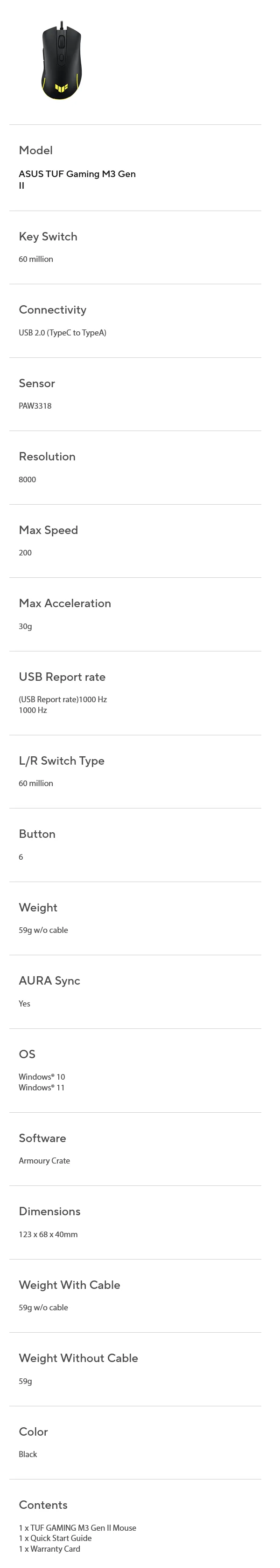 ASUS TUF Gaming M3 Gen II Optical Gaming Mouse – 60 Million Key Switch – Connectivity: USB 2.0 Type-C to Type-A – Sensor: Optical PAW3318 Gaming Sensor – Up to 8000 DPI – Report Rate: 1000Hz – 6 Total Buttons – Approx Weight: 59g without Cable – TUF Gaming M3 Gen II