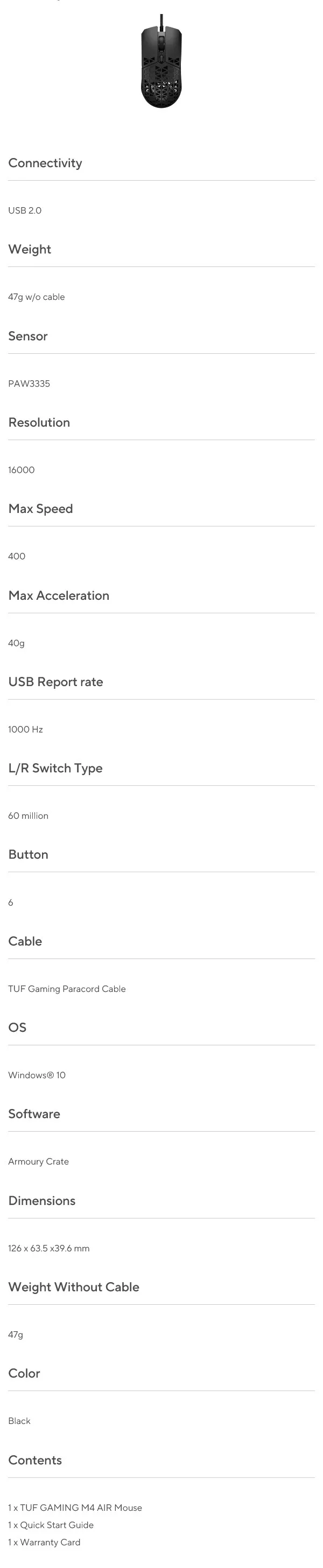 ASUS TUF M4 Air Optical Gaming Mouse – DPI: Up to 16,000 – Optical Sensor (PAW3335) – Weight: Approx 46g – Air Shell Design – IPX6 Water Resistance – ASUS Antibacterial Guard – TUF Paracord Cable – 100% PTFE Feet – 6 Tactile Programmable Buttons – Armoury Crate – USB 2.0 Connection – 1000Hz Report Rate – TUF GAMING M4 AIR
