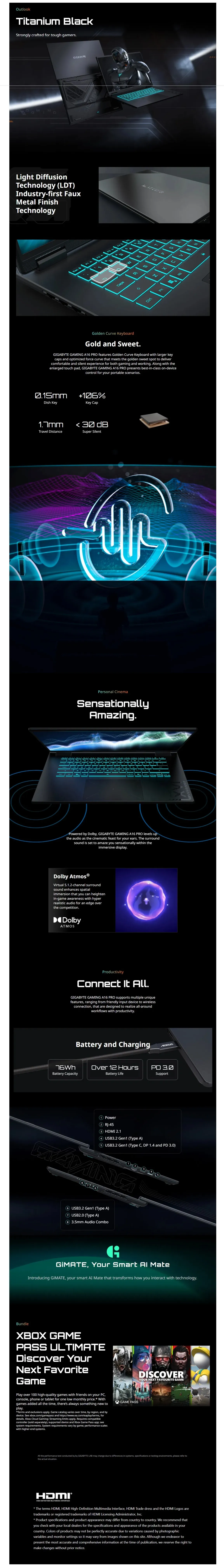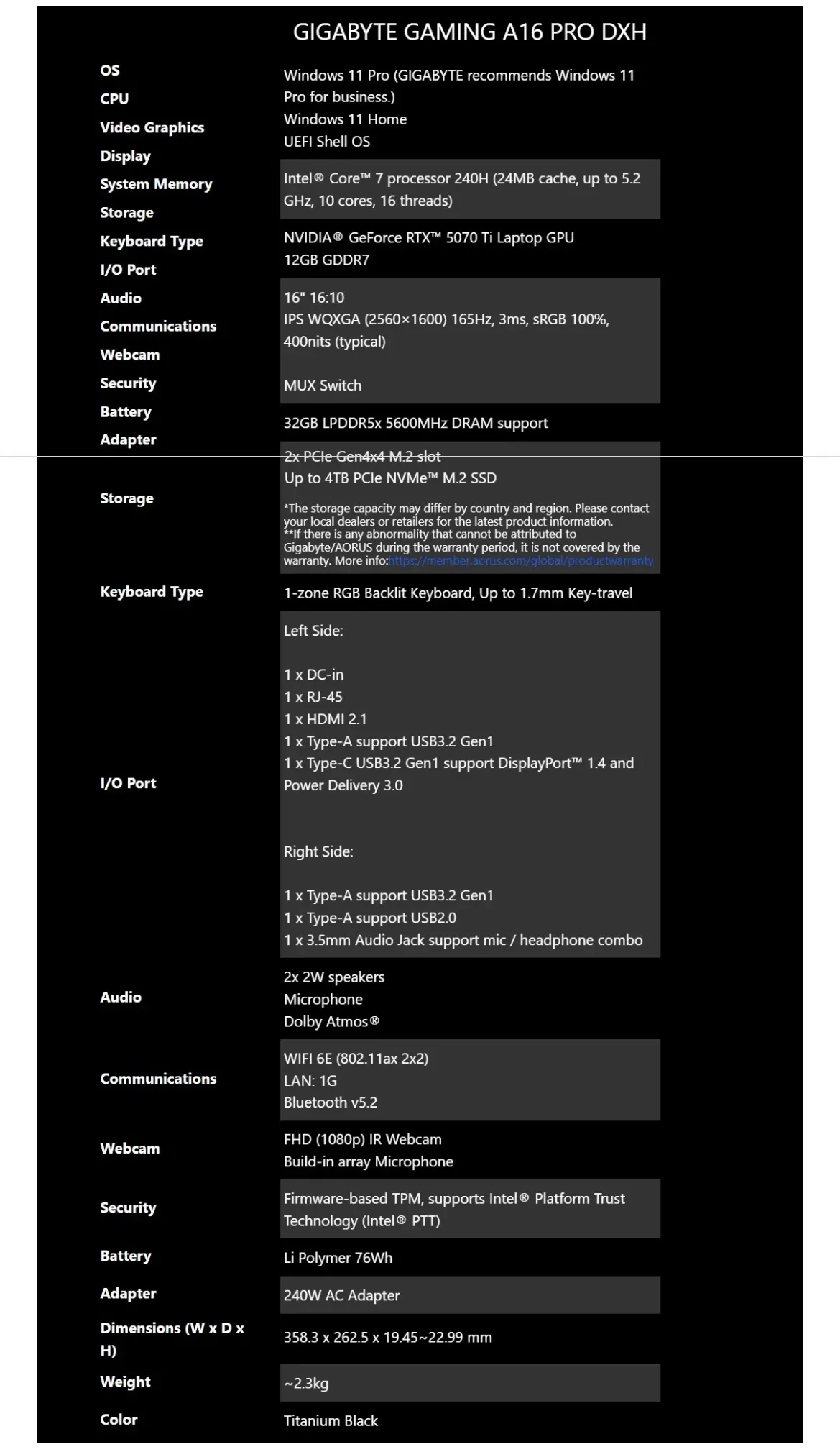 Gigabyte A16 Pro 16″ 165Hz QHD Gaming Laptop C7-240H 16GB 1TB RTX5070Ti W11H – Display: 16″ 16:10 IPS WQXGA (25601600) 165Hz, 3ms, sRGB 100%, 400nits (typical) – CPU: Intel Core 7 – RAM: 16GB – Storage: 1TB – GPU: NVIDIA GeForce RTX 5070 Ti- OS: Windows 11 Home – Network: WIFI 6E (802.11ax 2×2), Bluetooth v5.2 – I/O: 1 x Type-A support USB3.2 Gen1, 1x Type-A support USB2.0, 1x 3.5mm Audio Jack support mic/headphone combo – A16 PRO DXHG4AUCC4SH