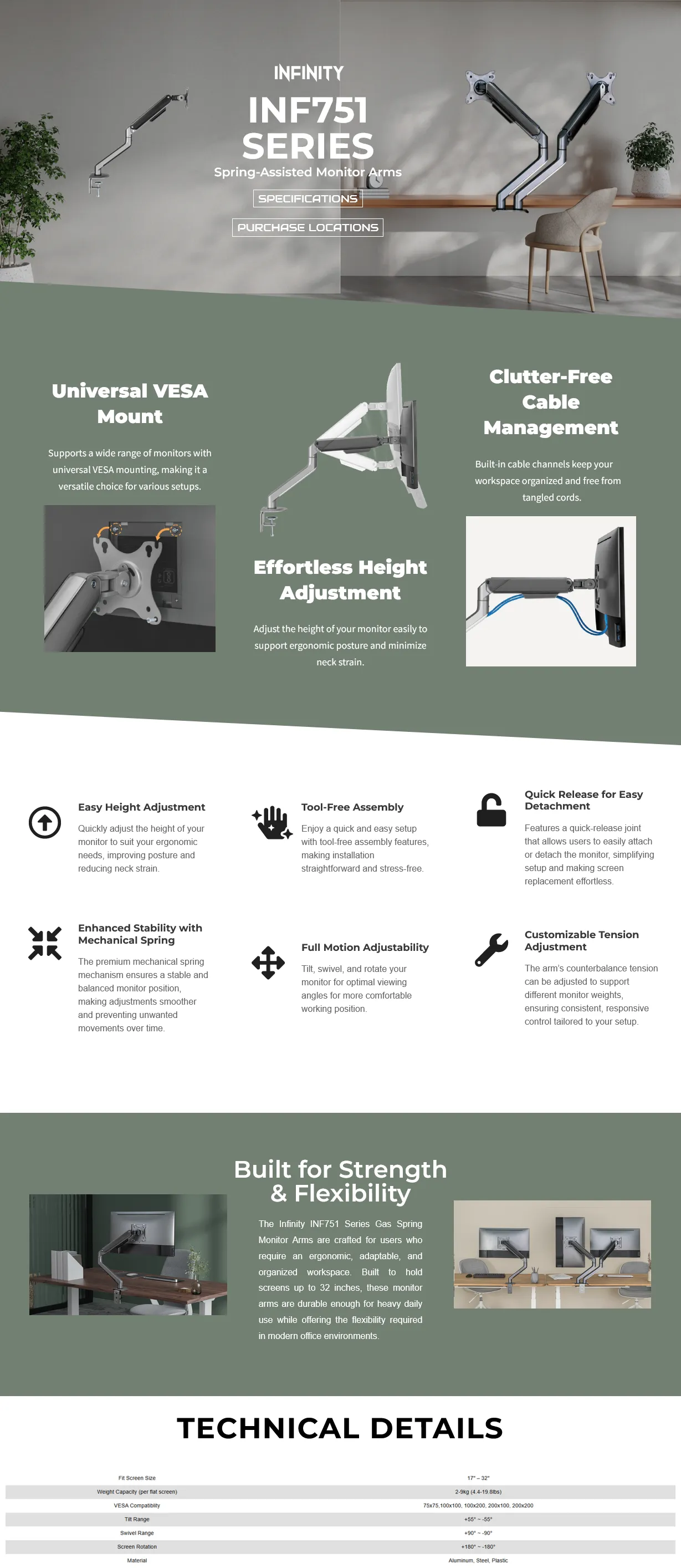 Infinity Single Monitor Economical Spring-Assisted Monitor Arm 17″-32″ – Grey – Fit Screen Size: 17″ – 32″ – Weight Capacity (per flat screen): 2-9kg – VESA Compatibility: 75×75, 100×100, 100×200, 200×100, 200×200 – Tilt Range: +55 ~ -55 – Swivel Range: +90 ~ -90 – Screen Rotation: +180 ~ -180 – Material: Aluminium, Steel, Plastic – INF751-C012