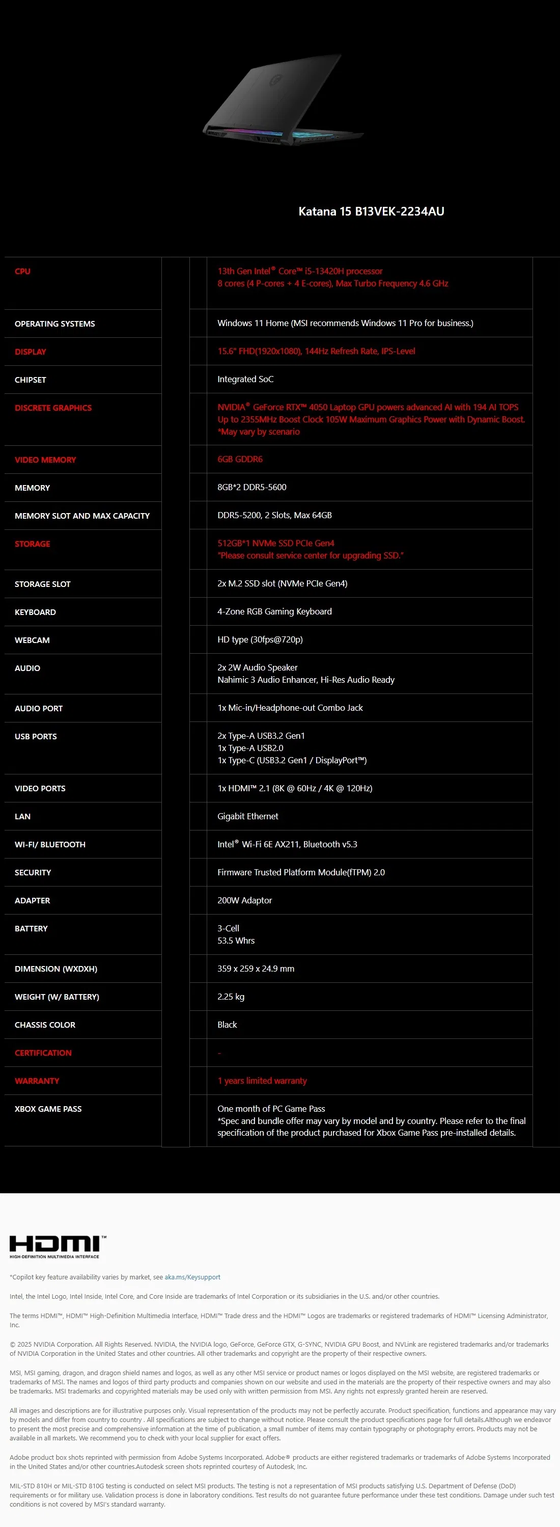 15.6″ FHD(1920×1080), 144Hz Refresh Rate, IPS-Level; 8GB*2, DDR5-5200; 13th Gen Intel Core i5-13420H processor; 512GB*1 NVMe SSD PCIe Gen4; NVIDIA GeForce RTX 4050 Laptop GPU powers advanced AI with 194 AI TOPS; Windows 11 Home