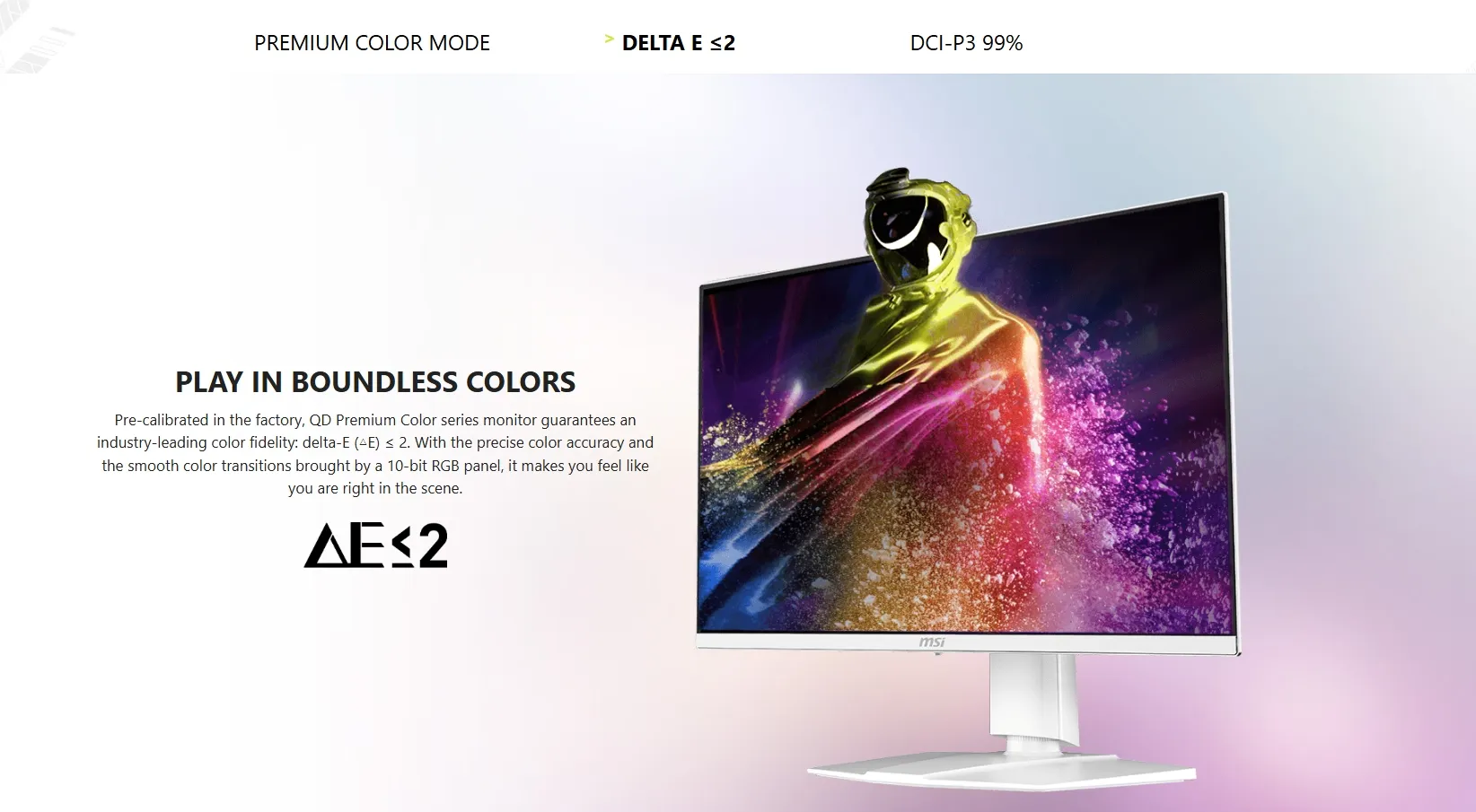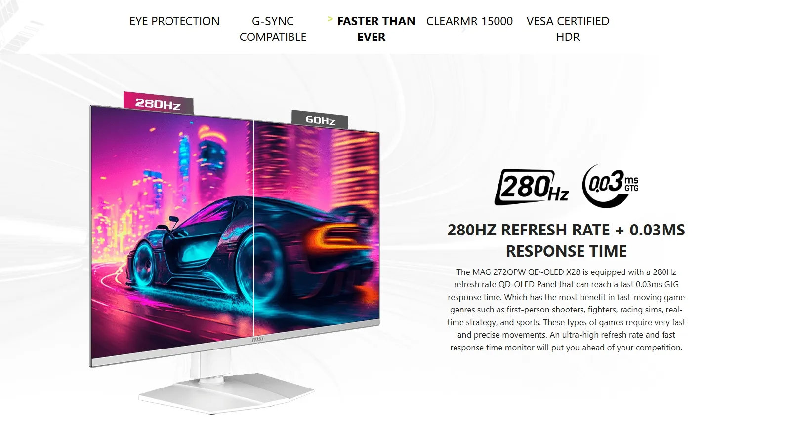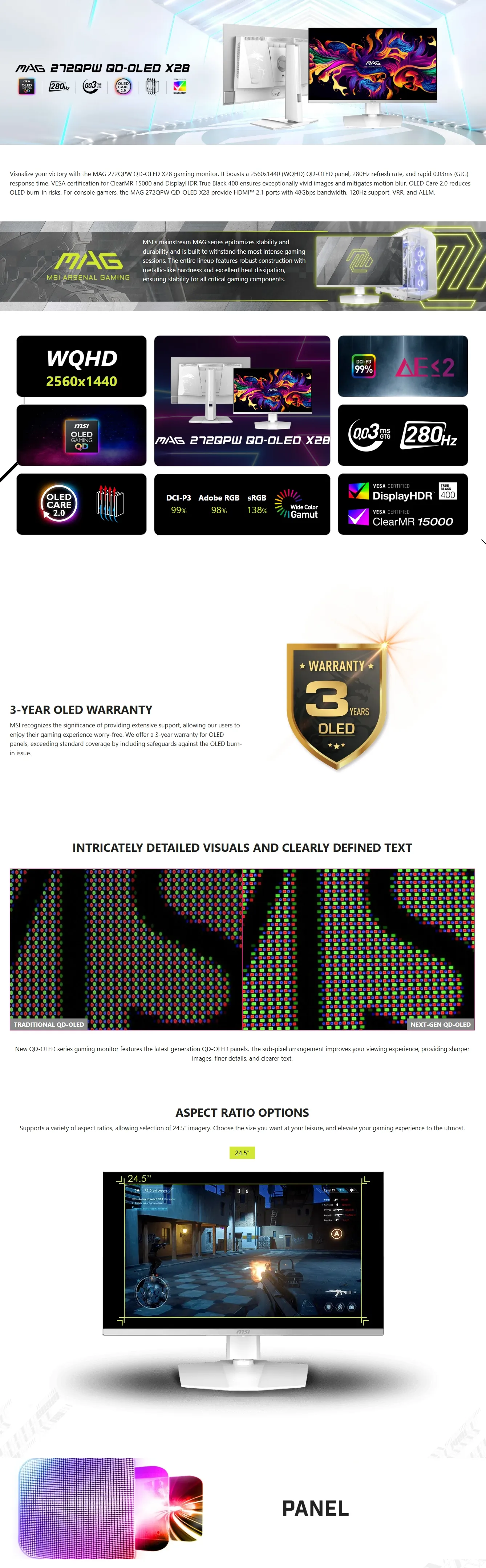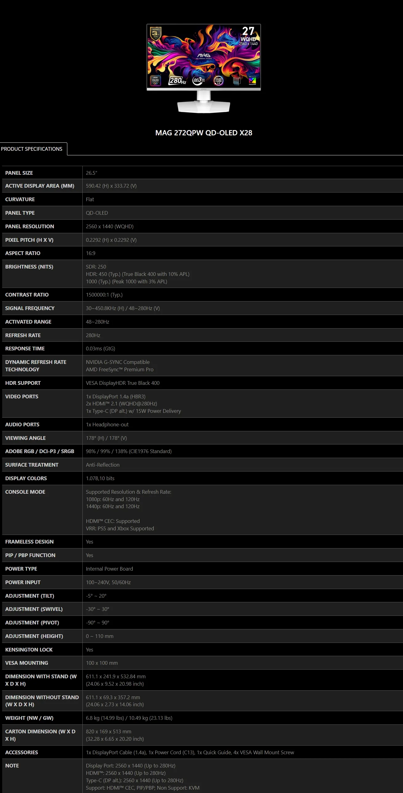 MSI MAG 272QPW QD-OLED X28 26.5″ 280Hz 0.03ms QHD QD-OLED Gaming Monitor – Panel Size: 26.5 – Panel Type: QD-OLED – Resolution: 2560×1440 (WQHD) – Aspect Ratio: 16:9 – Curvature: Flat – Refresh Rate: 280Hz – Response Time: 0.03ms – Brightness (typ): 250 – Contrast Ratio (typ): 1500000:1 – Displayable Colours: 10 bits – I/O: 1x DisplayPort 1.4a, 2x HDMI 2.1, 1x Type-C – Features: 3rd Gen QD-OLED Panel, Fastest 0.03ms GtG response time and 280Hz refresh rate – MAG 272QPW QD-OLED X28