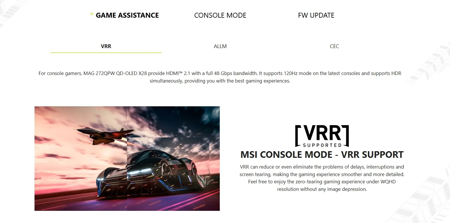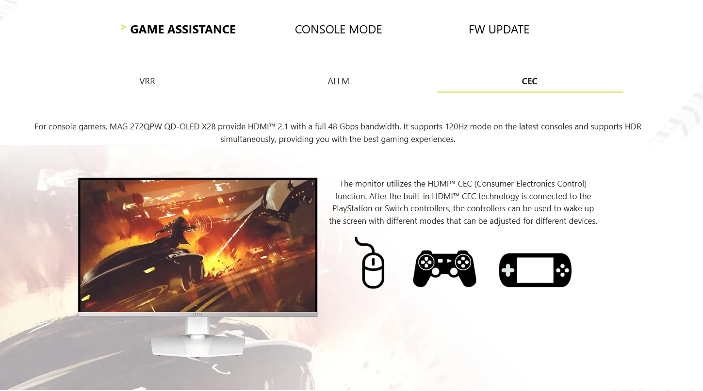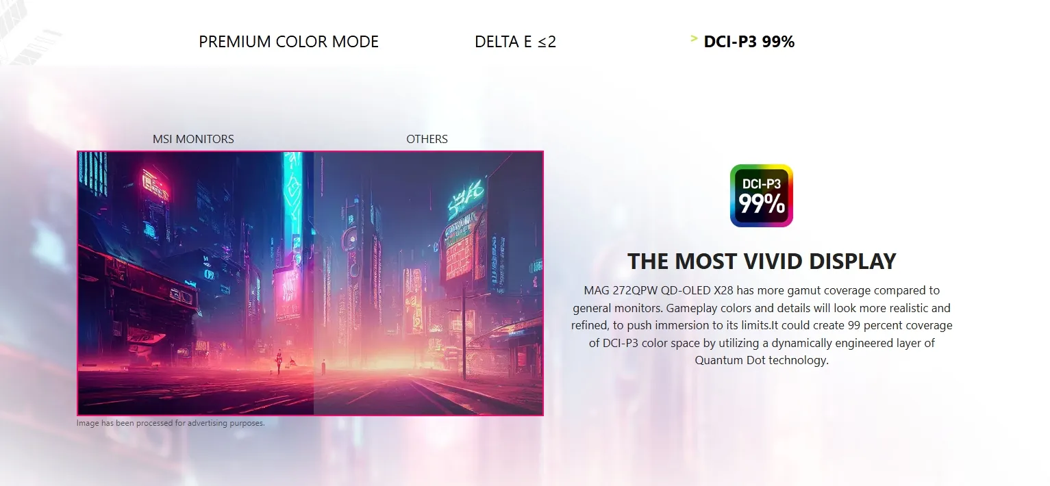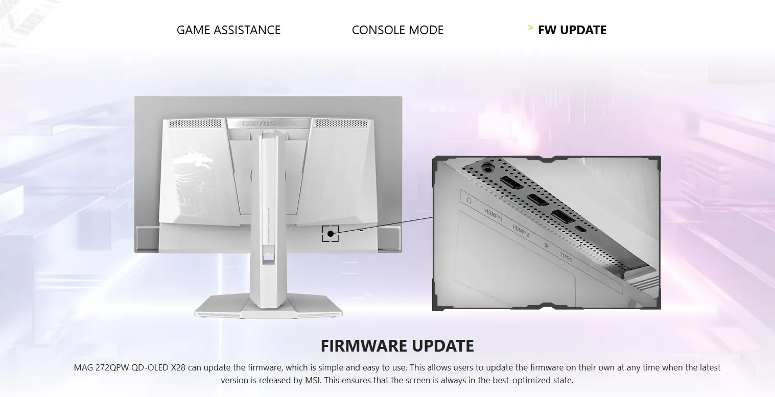 MSI MAG 272QPW QD-OLED X28 26.5″ 280Hz 0.03ms QHD QD-OLED Gaming Monitor – Panel Size: 26.5 – Panel Type: QD-OLED – Resolution: 2560×1440 (WQHD) – Aspect Ratio: 16:9 – Curvature: Flat – Refresh Rate: 280Hz – Response Time: 0.03ms – Brightness (typ): 250 – Contrast Ratio (typ): 1500000:1 – Displayable Colours: 10 bits – I/O: 1x DisplayPort 1.4a, 2x HDMI 2.1, 1x Type-C – Features: 3rd Gen QD-OLED Panel, Fastest 0.03ms GtG response time and 280Hz refresh rate – MAG 272QPW QD-OLED X28