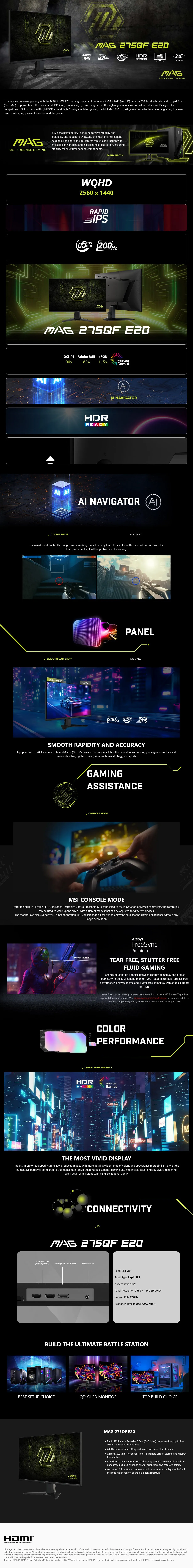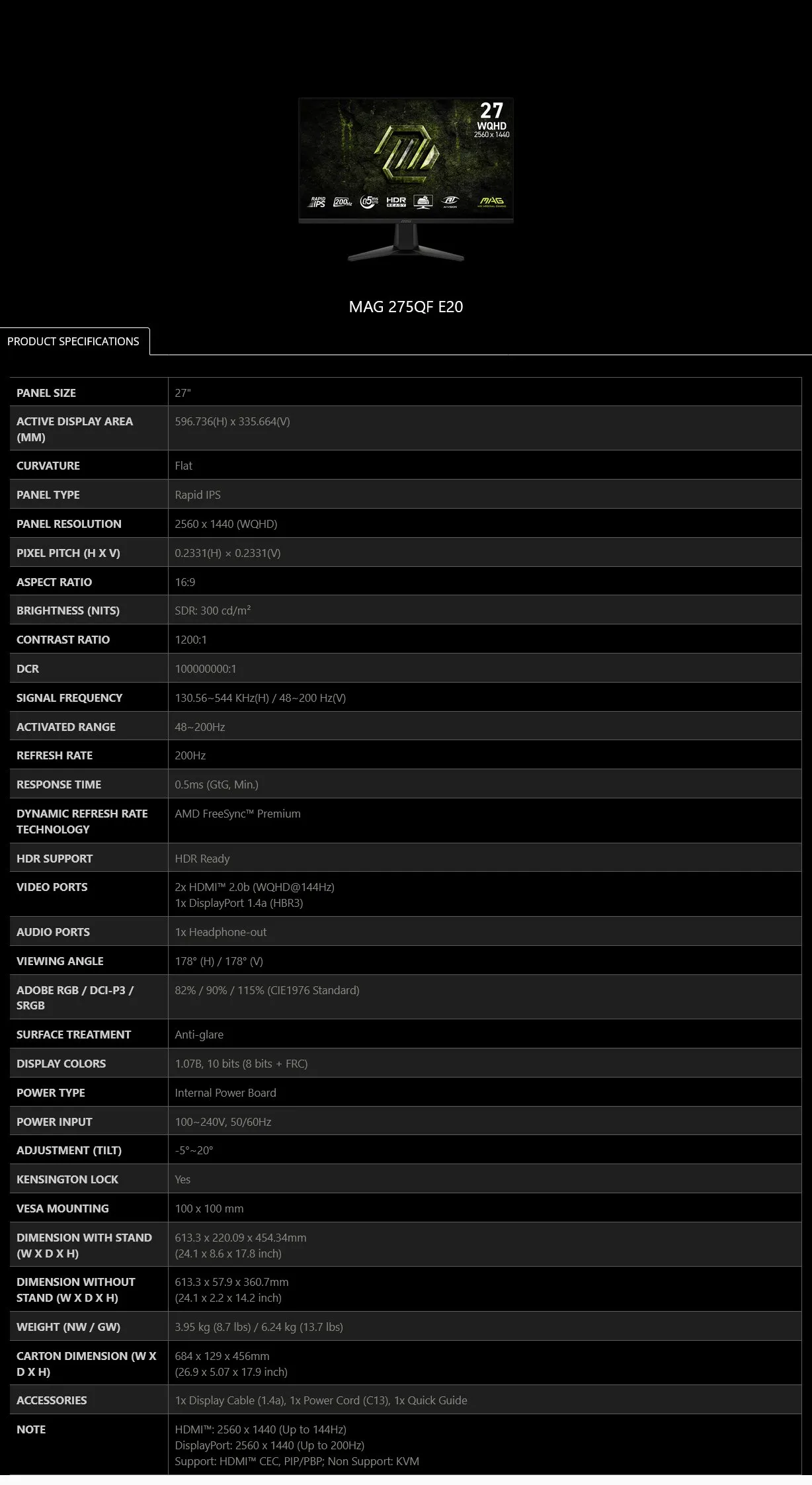 MSI MAG 275QF E20 27″ 200Hz WQHD 0.5ms HDR FreeSync Rapid IPS Gaming Monitor – Panel Size: 27″ – Panel Type: Rapid IPS – Resolution: 2560 x 1440 (WQHD) – Aspect Ratio: 16:9 – Curvature: Flat – Refresh Rate: 200Hz – Response Time: 0.5ms – Brightness (typ): 300 cd/m – Contrast Ratio (typ): 1200:1 – Displayable Colours: 1.07B, 10 bits (8 bits + FRC) – 2x HDMI 2.0, DisplayPort, Headphone-out – Tilt – VESA Mount: 100 x 100 mm – MAG 275QF E20