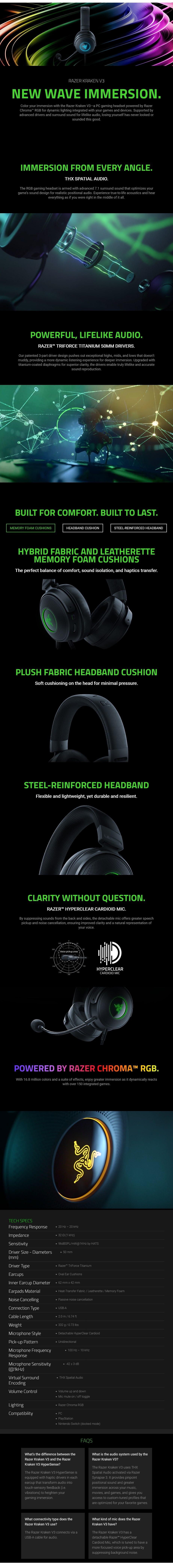 Razer Kraken V3 7.1 Surround Sound Wired Gaming Headset – Frequency Response: 20Hz–20kHz – Impedance: 32 (1kHz) – Drivers: 50mm Razer TriForce Titanium – Noise Cancelling: Passive noise cancellation – Connection: USB-A – Cable Length: 2.0m – Microphone: Unidirectional, Detachable HyperClear Cardioid – Microphone Frequency Response: 100Hz–10kHz – Microphone Sensitivity: (@1kHz) -42 ± 3 dB – RZ04-03770200 – 2 Years Limited Warranty